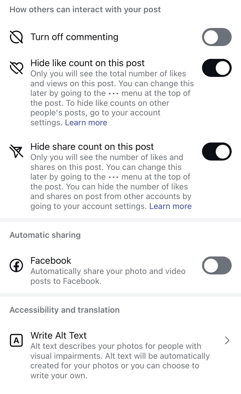 If you want to turn off this feature, you can do so by following the above steps and toggling the button off again. You can also hide likes on your posts under your draft posts before sharing them by selecting the ‘More Options’ tab and then choosing to ‘Hide the like count on this post.’ You can also hide the number of shares your post gets by tapping the ‘Hide share count on this post’ button as well. If you want your likes and shares to show up on your posts again publicly, you can adjust this setting by selecting the three-dotted horizontal menu option at the top of any of your posts. Keep in mind that with this setting, you’ll still be able to receive likes from others on the platform, though they’ll be viewable to you only.
