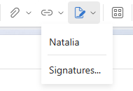 These settings can be configured in the same email signatures update tab by adding, updating, and selecting the signature you want to appear for these messages. You can also manually create a new email signature or add an existing one to a new email draft by selecting the ‘Signatures’ icon, which looks like a pen and paper, located next to the hyperlink paperclip icon feature, and selecting the signature that you want to use.